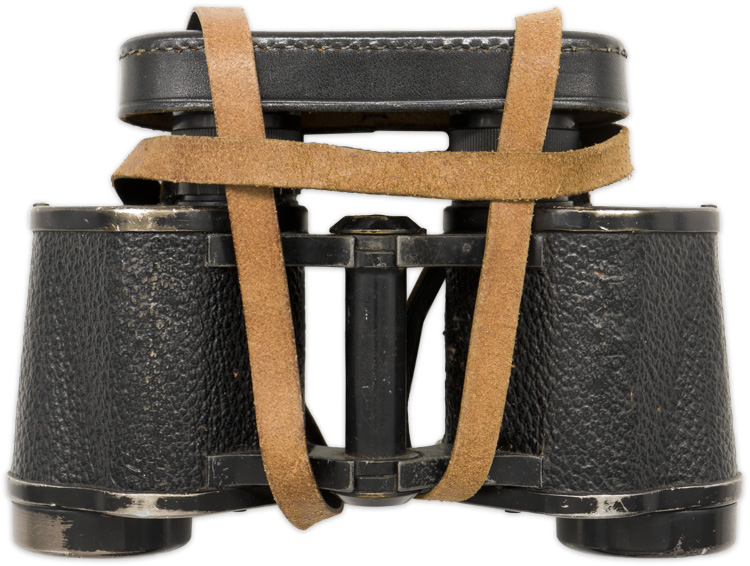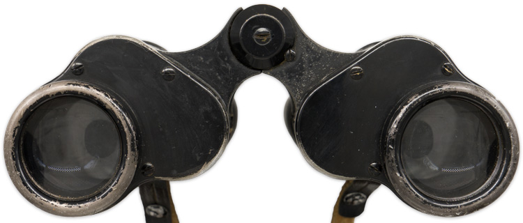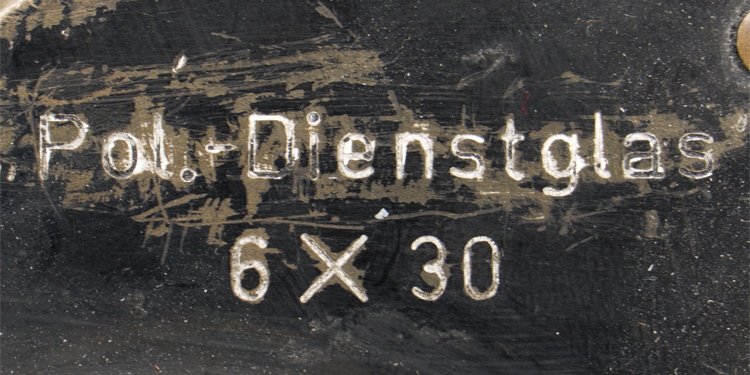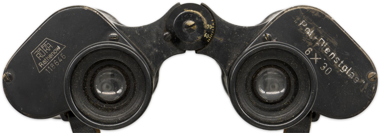 PHYSICAL DESCRIPTION: Tooled alloy and aluminum construction, 6 x 30, power, binoculars with molded black and bakelite fittings. The binoculars have molded, black and brown bakelite eye sockets which are fully intact and the focus adjustment still functions. The optics are clean. The right lens has a horizontal, reticule pattern with vertical bars emanating from the center, outward, to either side in increments of 10 degrees up to 40 degrees to each side with numerals at both 20 degrees. The central lens joining bracket with swivel width adjustment is intact and still functions. The right hand side, ocular end, body panel is well marked with the impressed designation, "Pol. Dienstglas 6 x 30", (Service Glasses), a serial number, "118646". Original neck strap & leather lense cover is present.