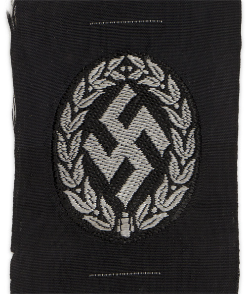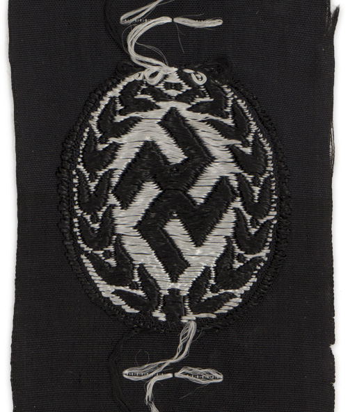 PHYSICAL DESCRIPTION: Original roll of 10 machine woven insignia consists of a vertically angular, canted swastika encompassed by a vertically oval, laurel leaf wreath in silver/grey rayon threads, mounted on a vertically oval, woven, black rayon base. The insignia is still on it’s original black rayon factory roll and is in overall excellent, unissued condition. Very cool to see on the original factory roll!