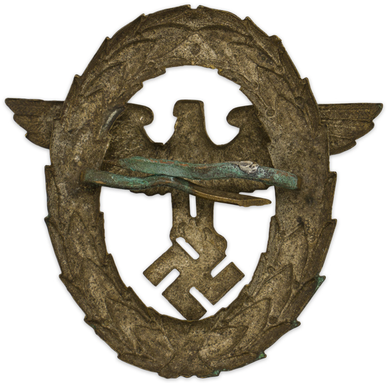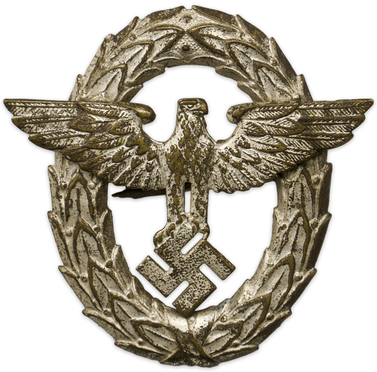 PHYSICAL DESCRIPTION: First pattern, (Circa April 1934-June 1936), two piece, die stamped alloy construction, police visor cap eagle with a frosted silvery/white washed finish. The nicely detailed, left facing eagle features extended, tapered, pointed tip, wings and is clutching a canted swastika in it’s talons. The eagle is braze mounted on an embossed, vertically oval, laurel leaf wreath with the eagles wings extending beyond the outer edges of the wreath and has a roughly, 1 3/4", (4.4cm), wingspan. The detailing includes feathering to the wings, veins to the laurel leafs and a subtly pebbled field to the swastika. The reverse of the insignia is a mirror image of the obverse and both soldered attachment prongs are intact.