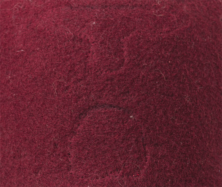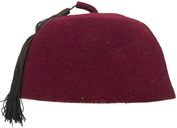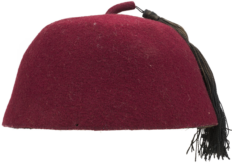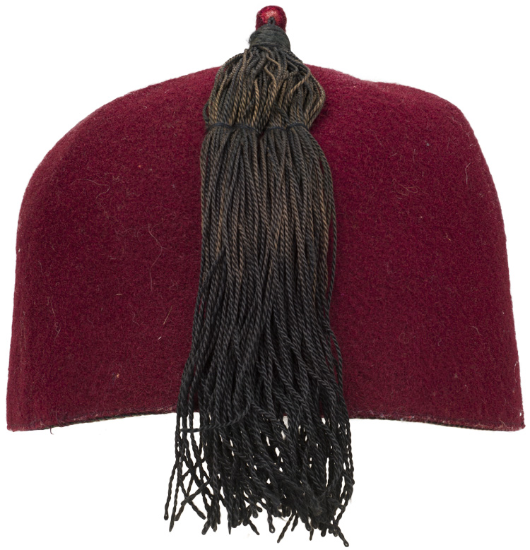 PHYSICAL DESCRIPTION: Nice quality, formed, maroon, rabbit fur felt, construction dress uniform fez. The fez features a two piece tassel to the top center of the crown. The tassel has a short piece of maroon felt inserted and stitched into the center of the crown with the correct, black, multi-strand, silk type material tassel sewn to the top. Insignia removed. The unlined interior has a full remaining leather sweatband machine stitched to the bottom edge. Roughly a size 54/55.