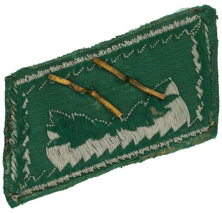 PHYSICAL DESCRIPTION: The 1937 pattern machine woven, bottle green rayon, construction collar tab with machine woven, acanthus leaves to the bottom of the forward edge and a saw-toothed, outer edge border in matte silver/aluminum flat-wire threads. Double rank pips.