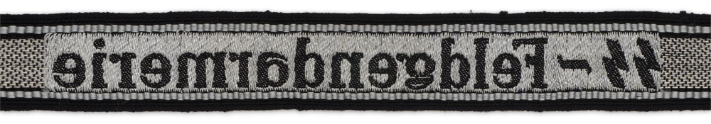PHYSICAL DESCRIPTION: Machine woven black rayon construction cufftitle with variant, BeVo-like, machine woven Latin script and SS runes, "SS-Feldgendarmerie", in silvery/grey cotton threads. The cufftitle is bordered at both the top and bottom edges in horizontally woven, seven strand, silver/grey threads. The cufftitle has the typical "salt & pepper" pattern reverse. Scarce cufftitle.