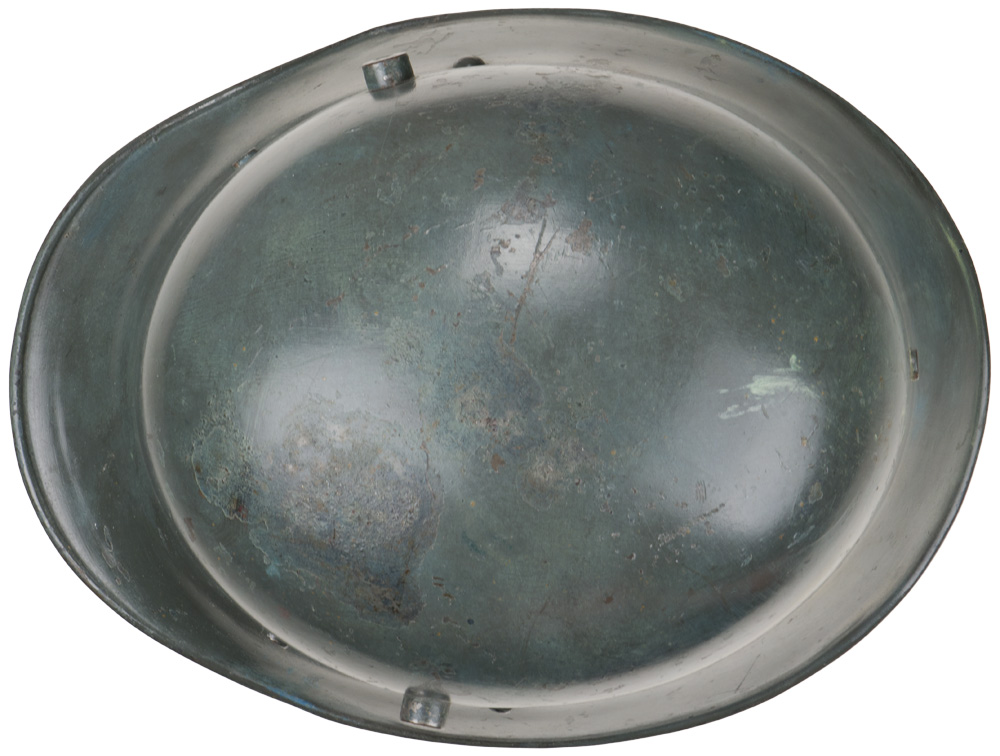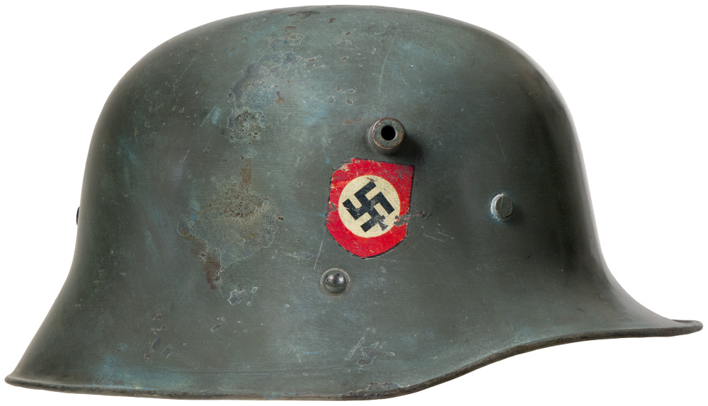 PHYSICAL DESCRIPTION: The heavy, stamped, sheet steel construction M16, style, helmet retains about most of its transitional, field-grey over-paint. The left side of the helmet has a black based, silver, wreathed, police eagle decal which is retained about 90%. Under the wing of the eagle can be seen the typicaly attachment hole for the Austrian insignia. The right side of the helmet has a NSDAP party shield decal with a narrow black outer border, a red base field with a central, white, circle with a canted, black, swastika. The party shield decal is retained about 95%. All three liner retaining rivets, both of the extended, M16/M18 style, ventilation side lugs and both of the large, dome headed, chinstrap, retaining rivets are all intact. Complete with original three pad leather liner. Original chinstrap. Nice large size, about 60 head size. Textbook Austrian transitional!