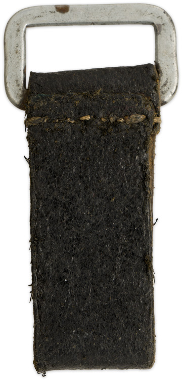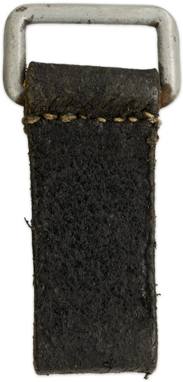 The belt loop strap with "D" ring served a large variety of functions and was widely used. Roughly 25mm wide, 90mm long, blackened leather construction belt loop strap. One end of the strap is folded over and stitched down and secures the rectangular steel "D" ring. Faint SS/RZM markings. The strap is in overall very good condition with minimal age and usage wear.