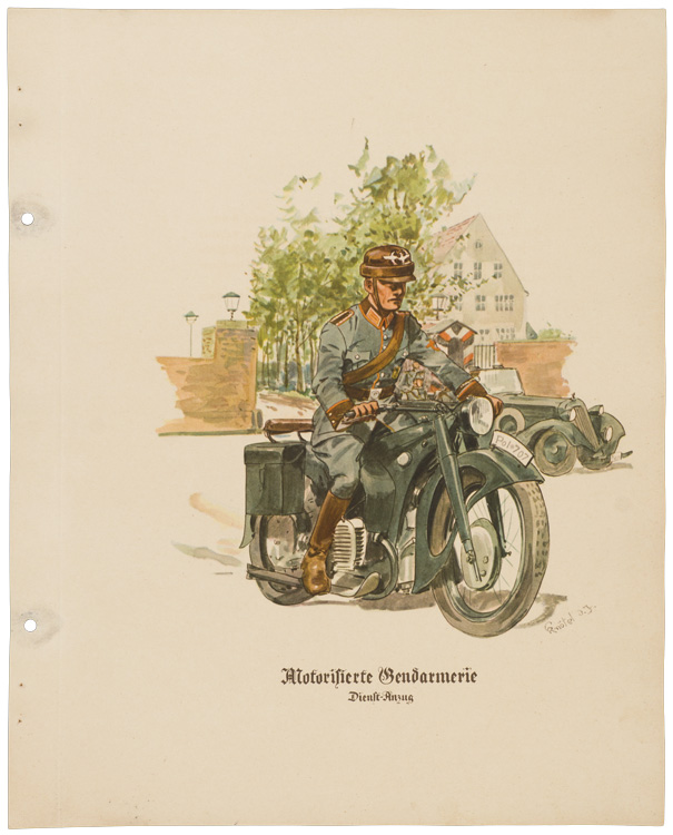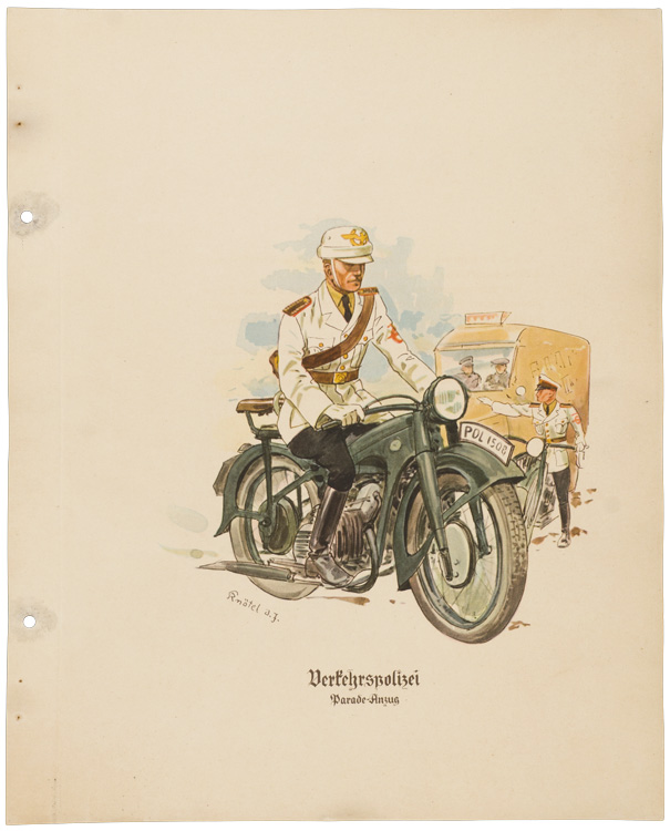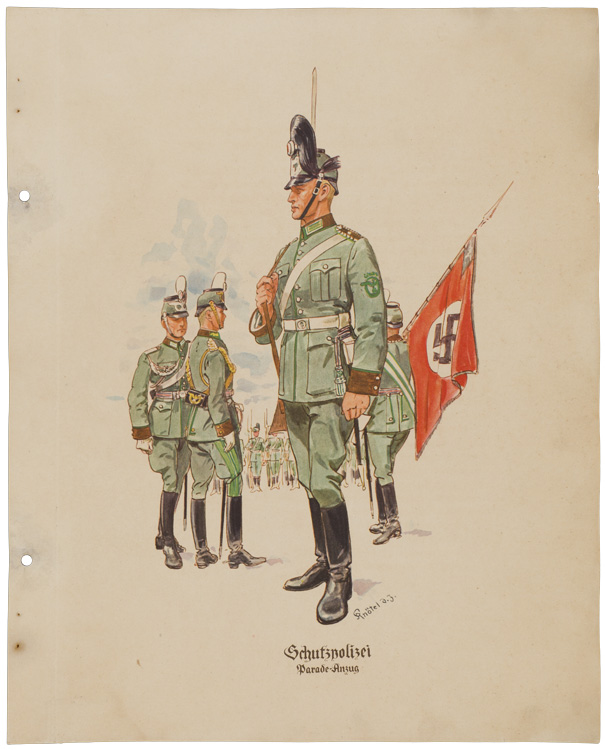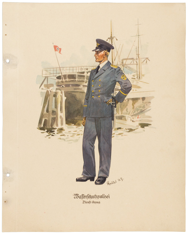NOTED GERMAN ARTIST HERBERT KNÖTELIn 1939, Brend'amour" Simbart & Company, a publishing company in Munich, Germany, published an art folio about the Third Reich German police consisting of thirteen high quality color printed illustrations of the new German Police uniforms. The art work was done by the famous German artist Herbert Knötel. The overall 10" by 13" size folio consists of a hard cover front and rear in a police grey green color with the cover featuring the German police eagle insignia embossed in silver color with a black swastika.