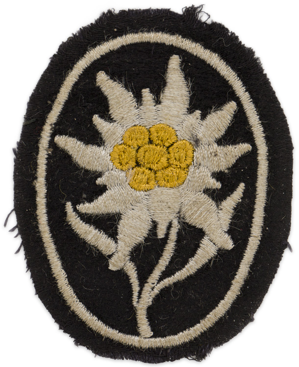 BACKGROUND: During WWII the German army fielded nine Mountain Divisions with an additional six Waffen-SS, (Armed-SS), Mountain Divisions. Generally speaking the Mountain Divisions were specially trained and equipped Infantry Divisions. On October 1ST 1943 Waffen-SS personnel serving with Mountain troop units were authorized wear of the traditional Edelweiss as an identifying insignia. The Edelweiss insignia was issued in two forms with one designed for wear on the left side of the Bergmütze, (Mountain cap), and another design for wear on the upper right sleeve of the greatcoat and tunic. The design of these badges closely followed the pattern of the earlier introduced, (May 2ND 1939), army Edelweiss badges. Of Note: The only differences between the army and the SS Edelweiss sleeve badges was the coloration and the army style Edelweiss had a simulated mountaineers rope with piton as opposed to the SS straight oval ring border.