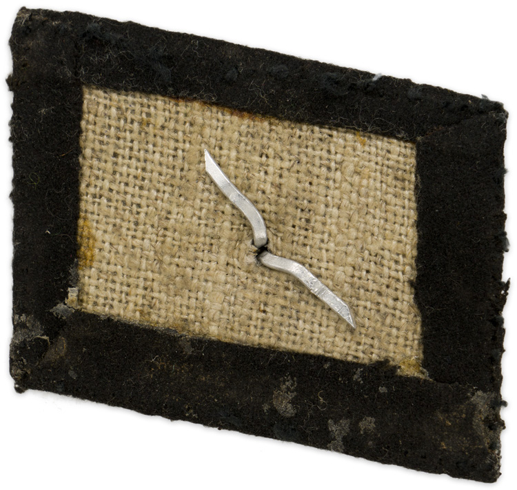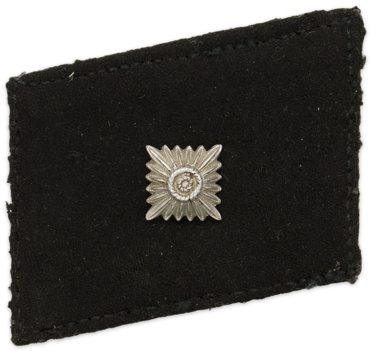 PHYSICAL DESCRIPTION: Third and final pattern, (Circa August 1940 to May 1945), un-piped, black wool construction, left hand side, rank collar tab with a single rank pip positioned on the center. The collar tab is mounted on a tan buckram backing. The collar tab indicates the Waffen-SS rank of SS-Unterscharführer. Uniform removed.