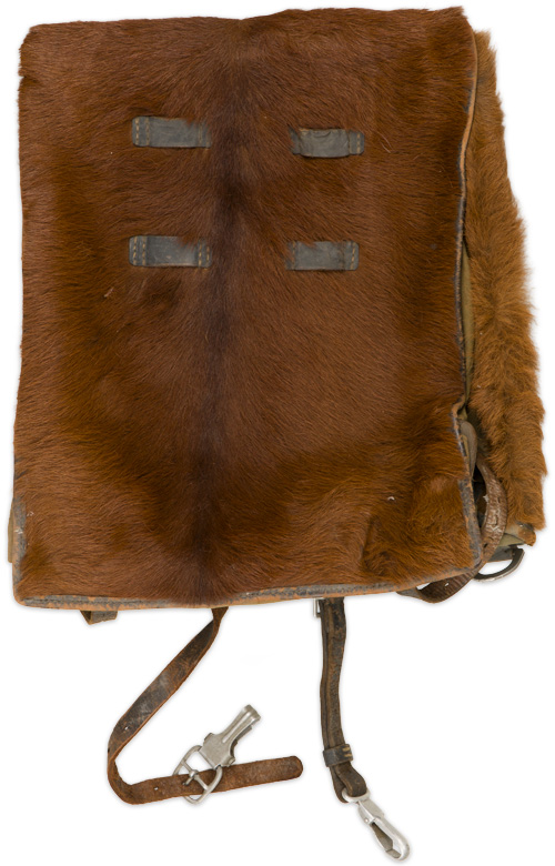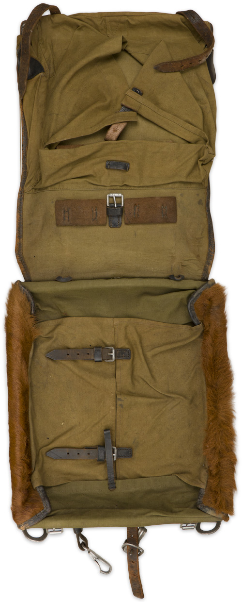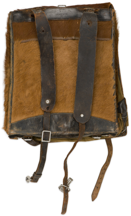 PHYSICAL DESCRIPTION: An olive drab, fur covered, canvas pack with leather and canvas fittings, roughly 31cm wide, 40cm tall and 5cm deep, with a fold-over flap that covers its entire front. Straps, buckles and buttons look to be complete with the exception of the bottom, left facing spring clip as it does not function properly, and the leather back straps appear to have been reconstructed. Nice SS marking to the back of the pack. Sows the expected age and use.