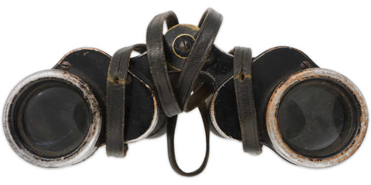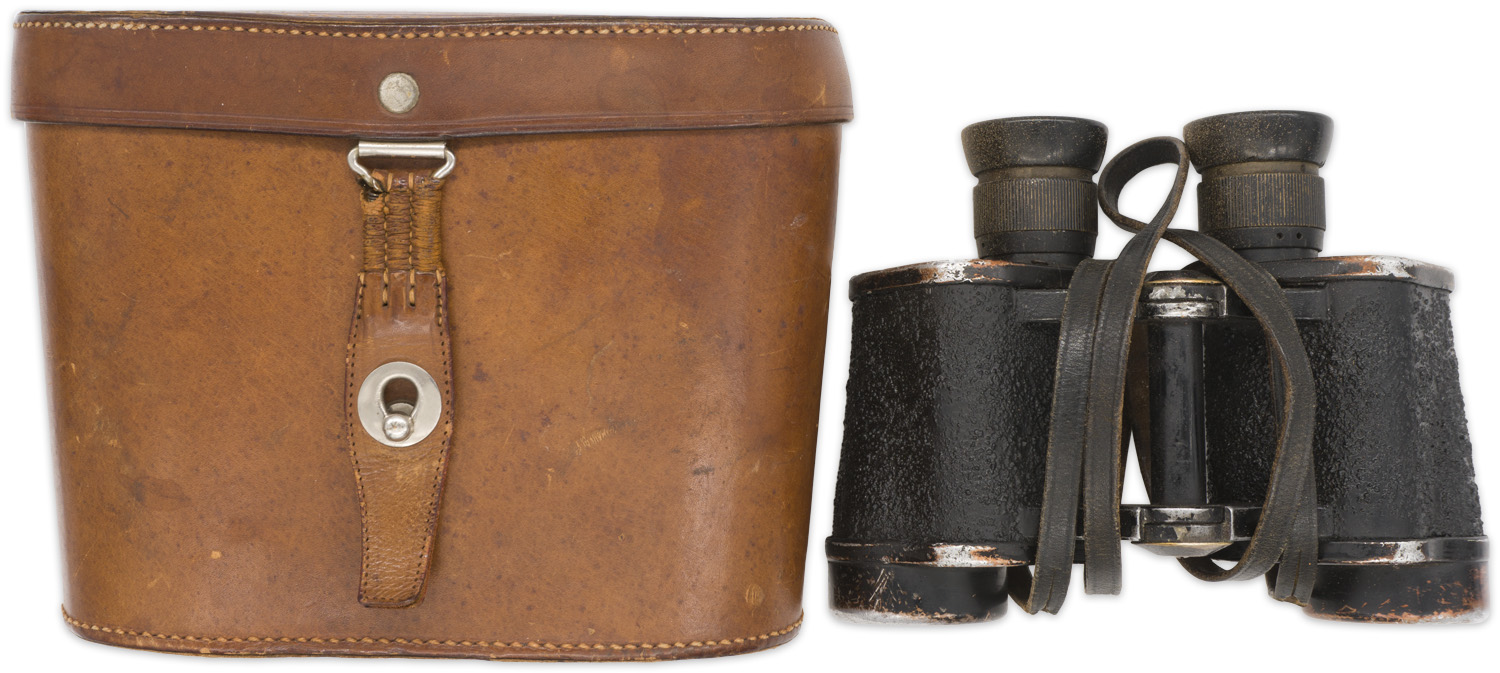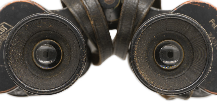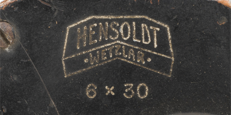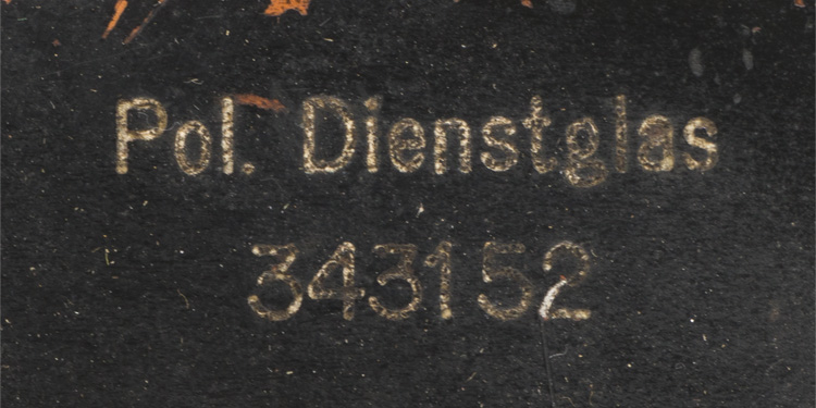 PHYSICAL DESCRIPTION: Tooled alloy and aluminum construction, 6 x 30, power, binoculars with molded black and bakelite fittings. The binoculars have molded, bakelite eye sockets which are fully intact and the focus adjustment still functions. The optics are fairly clean with a couple of areas of spotting. The right lens has a horizontal, reticule pattern with vertical bars emanating from the center, outward, to either side in increments of 10 degrees up to 40 degrees to each side with numerals at both 20 degrees. The central lens joining bracket with swivel width adjustment is intact and still functions. The right hand side, ocular end, body panel is well marked with the impressed designation, "Pol. Dienstglas 6 x 30", (Service Glasses), a serial number, "343152". Rough textured finish to the main body looks restored. Original neck strap is present. Also included is an original private purchase case.