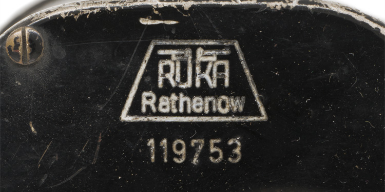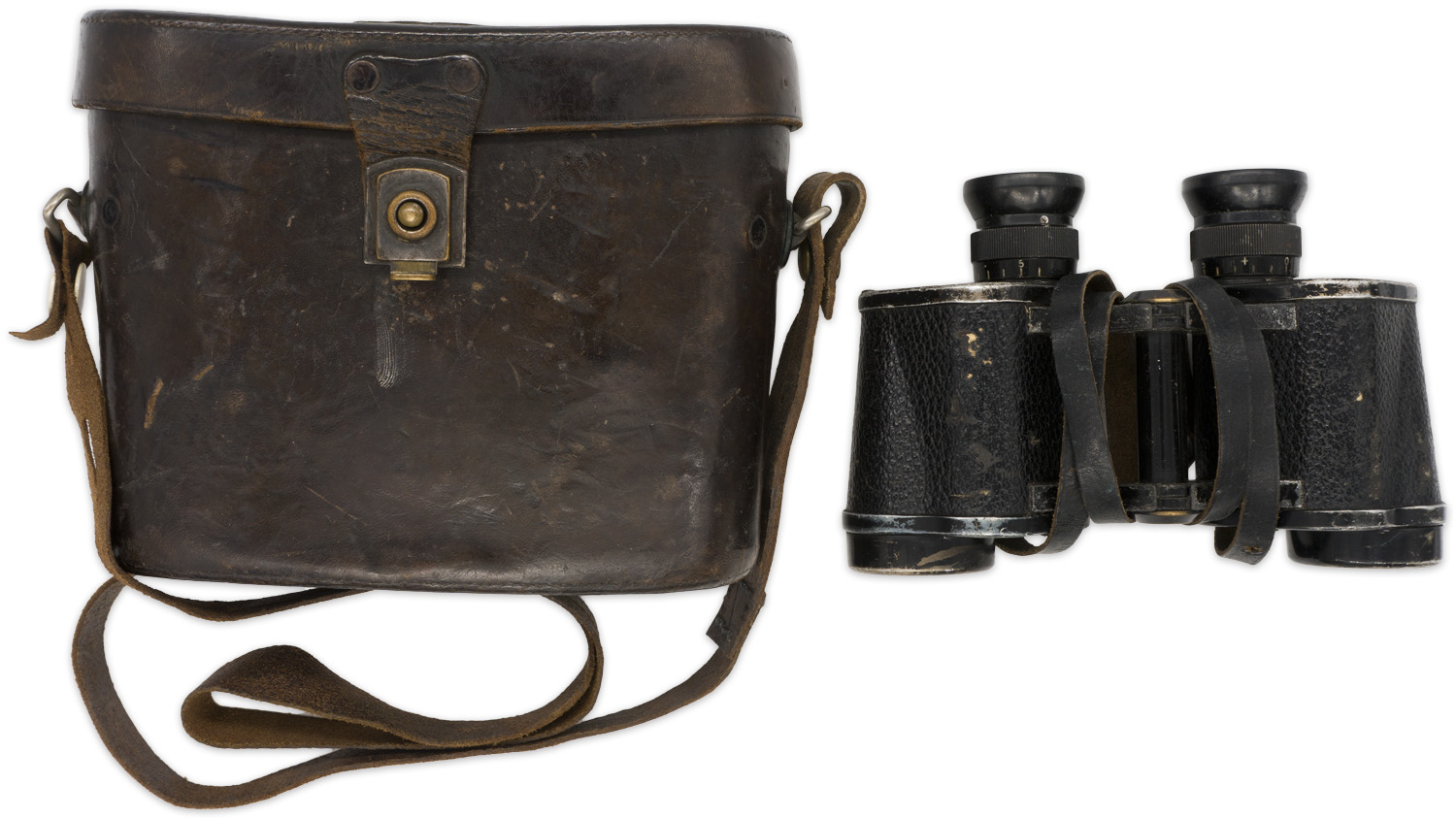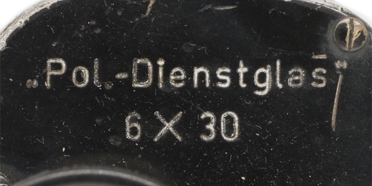 PHYSICAL DESCRIPTION: Tooled alloy and aluminum construction, 6 x 30, power, binoculars with molded black and bakelite fittings. The binoculars have molded, black and brown bakelite eye sockets which are fully intact and the focus adjustment still functions. The optics are clean with a couple of areas of spotting. The right lens has a horizontal, reticule pattern with vertical bars emanating from the center, outward, to either side in increments of 10 degrees up to 40 degrees to each side with numerals at both 20 degrees. The central lens joining bracket with swivel width adjustment is intact and still functions. The right hand side, ocular end, body panel is well marked with the impressed designation, "Pol. Dienstglas 6 x 30", (Service Glasses), a serial number, "119753". Original neck strap is present. Also included is an original private purchase case with a repaired shoulder strap.