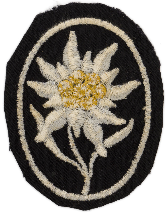 BACKGROUND: During WWII the German army fielded nine Mountain Divisions with an additional six Waffen-SS, (Armed-SS), Mountain Divisions. Generally speaking the Mountain Divisions were specially trained and equipped Infantry Divisions. On October 1ST 1943 Waffen-SS personnel serving with Mountain troop units were authorized wear of the traditional Edelweiss as an identifying insignia. The Edelweiss insignia was issued in two forms with one designed for wear on the left side of the Bergmütze, (Mountain cap), and another design for wear on the upper right sleeve of the greatcoat and tunic. The design of these badges closely followed the pattern of the earlier introduced, (May 2ND 1939), army Edelweiss badges. Of Note: The only differences between the army and the SS Edelweiss sleeve badges was the coloration and the army style Edelweiss had a simulated mountaineers rope with piton as opposed to the SS straight oval ring border.