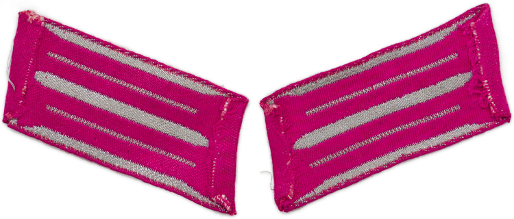 PHYSICAL DESCRIPTION: Machine woven rayon collar tabs with bright silver/aluminum flat wire litzen and interwoven carmine/pink rayon, branch of service and center stripes.