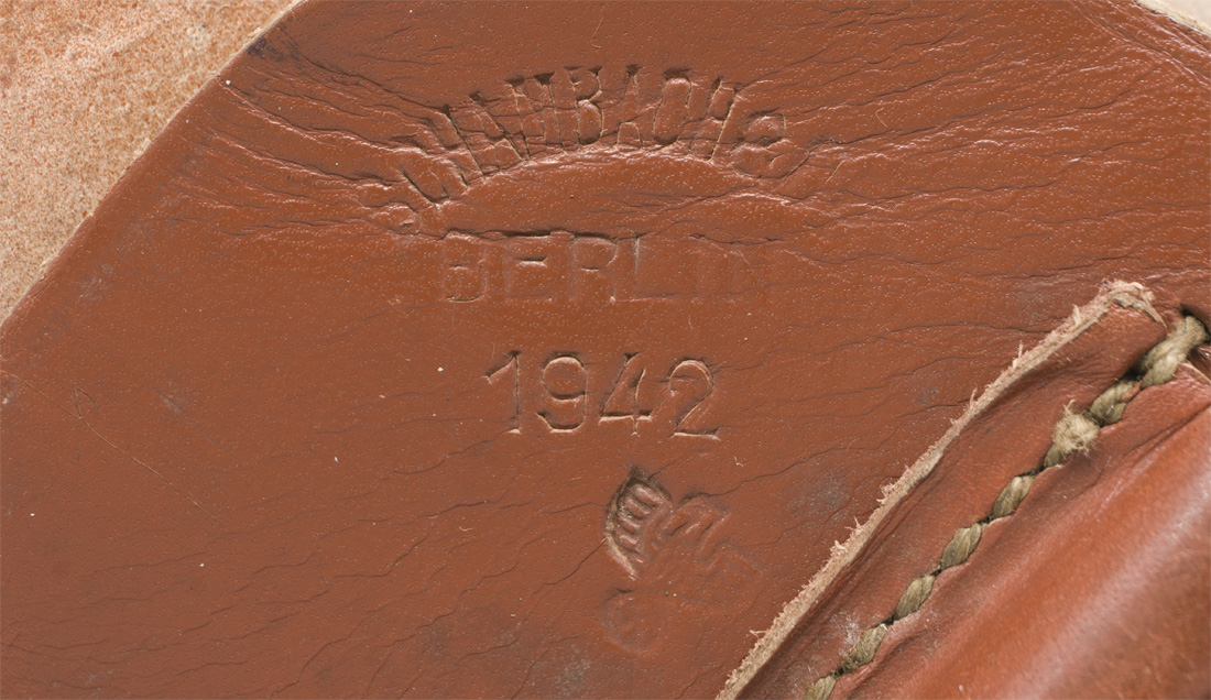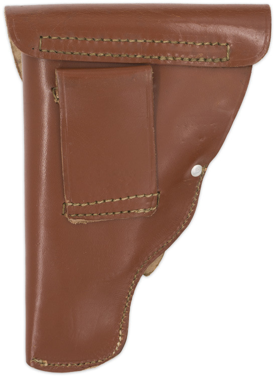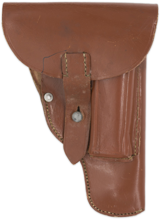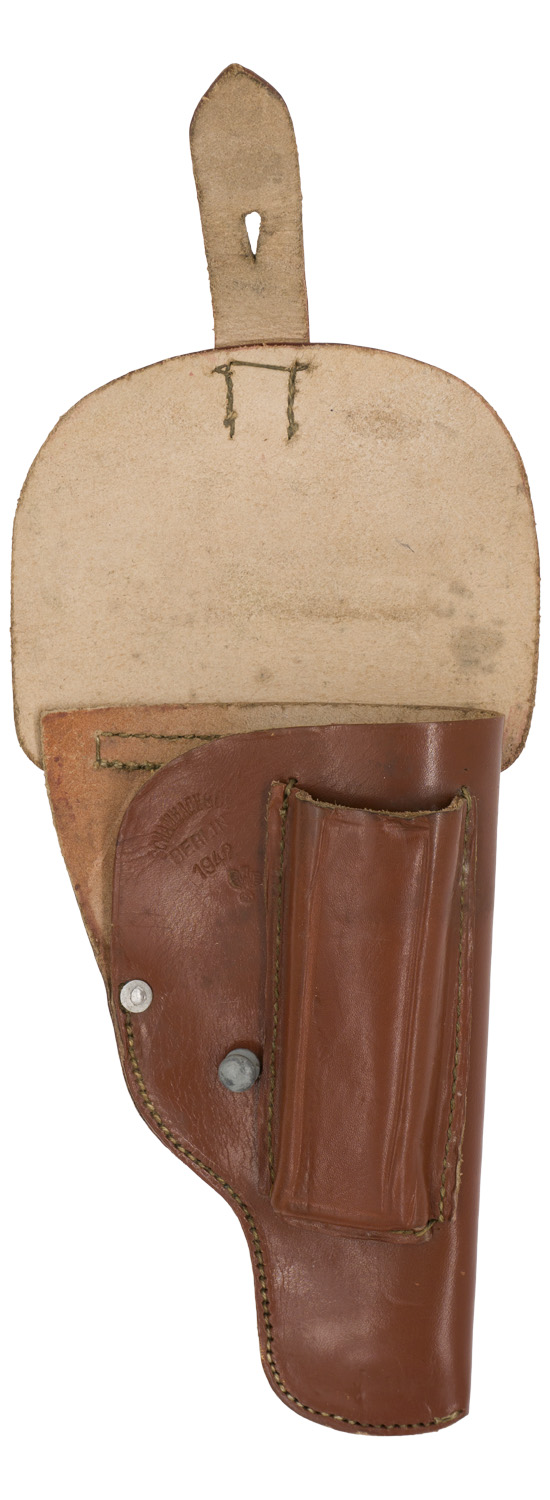 PHYSICAL DESCRIPTION: Smooth, brown leather, holster with fold over top flap with stitched on vertical closure strap with single cut-out eyelet. The top flap closure strap attaches to a steel stud on the scalloped left hand side of the holsters body. The holster body has a stitched on spare magazine pocket to the right front. The reverse of the holster has a single, wide, stitched on, slightly diagonally angled, vertical belt loop. Nicely maker marked "SCHAMBACH & Co" and dated for 1942. Also has a nice impressed waffen-amt eagle marking. Small ink mark on the flap. Mint & nice!