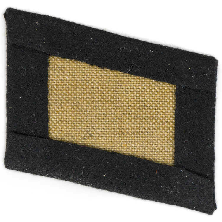 PHYSICAL DESCRIPTION: Third and final pattern, (Circa August 1940 to May 1945), blank, black wool construction left hand side, rank collar tab with no pips, tress, or piping, mounted on a tan buckram base. The collar tab indicates the Waffen SS rank of SS Schütze.