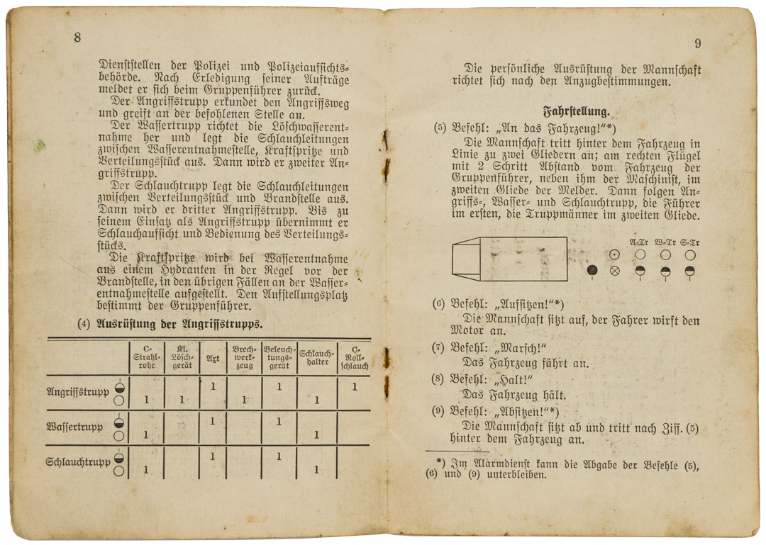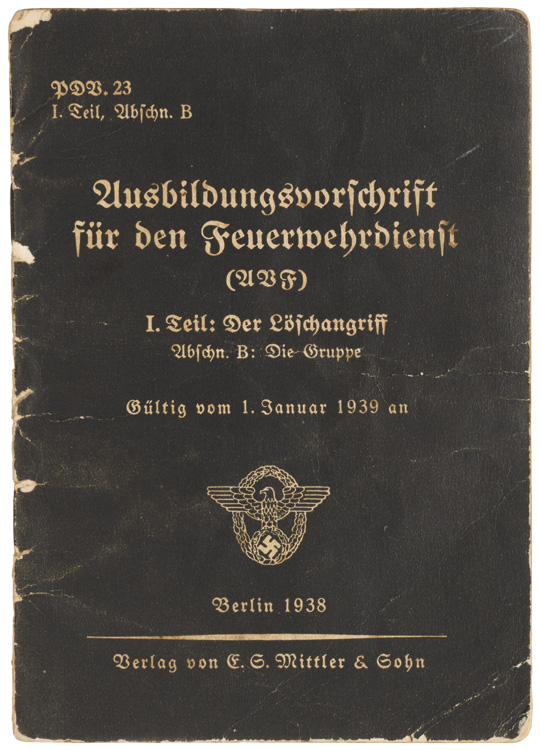 A 10.5cm x 15cm soft cover booklet titled "Ausbildungsvorschrift für den Feuerwehrdiens"t or "Training Regulation for the Fire Service". The booklet has an ink stamp to the interior of the front cover that reads "Köering Machine and Apparatus Construction Joint Stock Company" and consists of 16 pages of text. Shows moderate/heavy usage and wear to the edges and pages.
