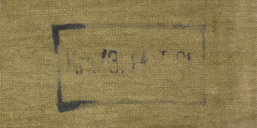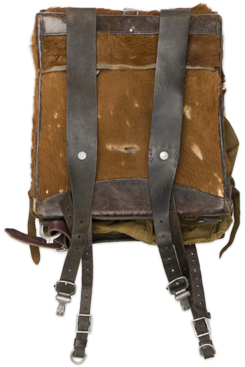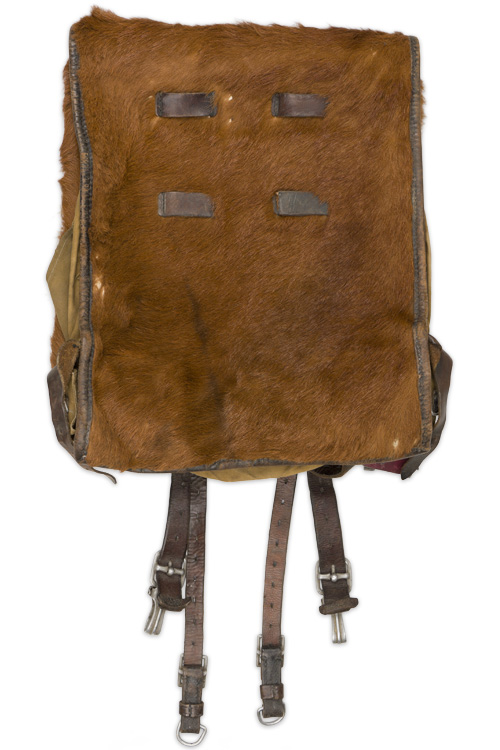 PHYSICAL DESCRIPTION: An olive drab, fur covered, canvas pack with leather and canvas fittings, roughly 31cm wide, 40cm tall and 5cm deep, with a fold-over flap that covers its entire front. Straps, buckles and buttons look to be complete. One of the leather equipment tabs is torn on the back of the pack, but complete. Nice SS marking to the back of the pack. Sows the expected age and use.