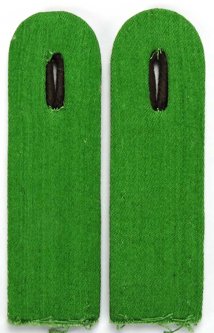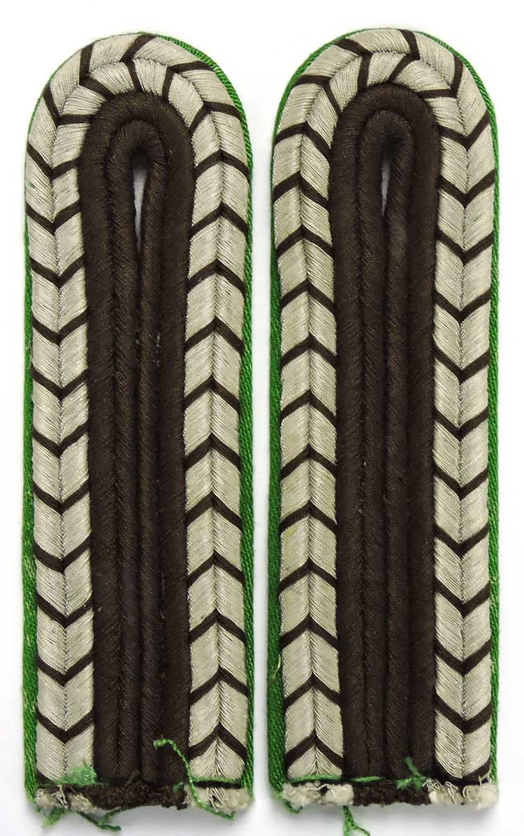 PHYSICAL DESCRIPTION: Second pattern, sew on shoulder boards as introduced along with new uniforms in July 1936. The shoulder boards feature dual, outer edge, matte silver/aluminum Russian braid with evenly spaced, interwoven chocolate brown "V"s, encompassing dual, inner, chocolate brown braids, mounted on a green rayon truppenfarbe base with a single stamped alloy rank pip. The shoulder boards represent rank of Wachtmeister serving with the Schutzpolizei des Reiches.