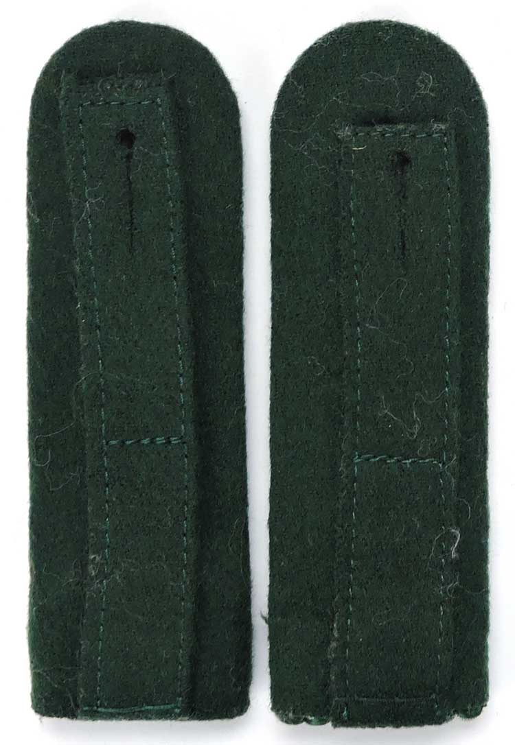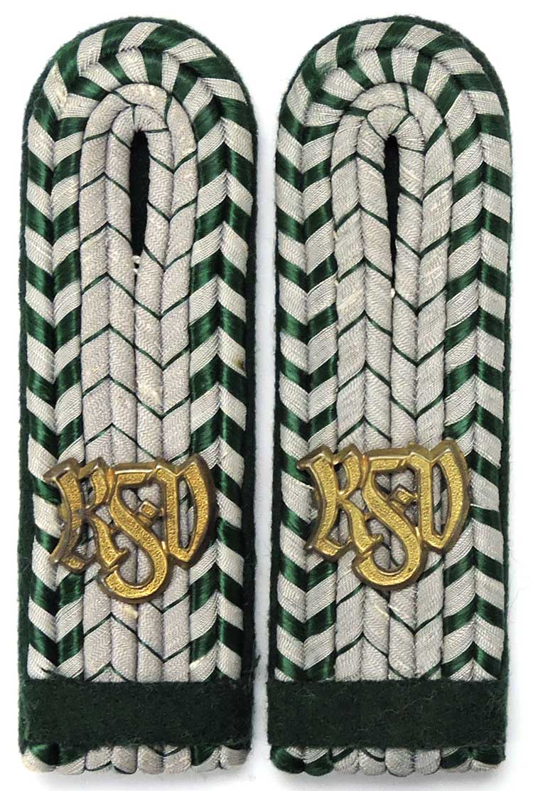 PHYSICAL DESCRIPTION: The 1937 pattern, slip on shoulder boards features dual, outer edge, alternating dark bottle green rayon Russian braid and interwoven silver/aluminum flat-wire "V"s, encompassing four, inner, matt silver/aluminum Russian braids with evenly spaced, interwoven dark bottle green "V"s, with the stamped zinc Gothic letter cyphers, "RFV", indicating Reichsfinanzverwaltung, (National Finance Administration). The shoulder boards have the addition of a narrow dark green wool strip sewn near the slip on end. Rank pips have been removed.