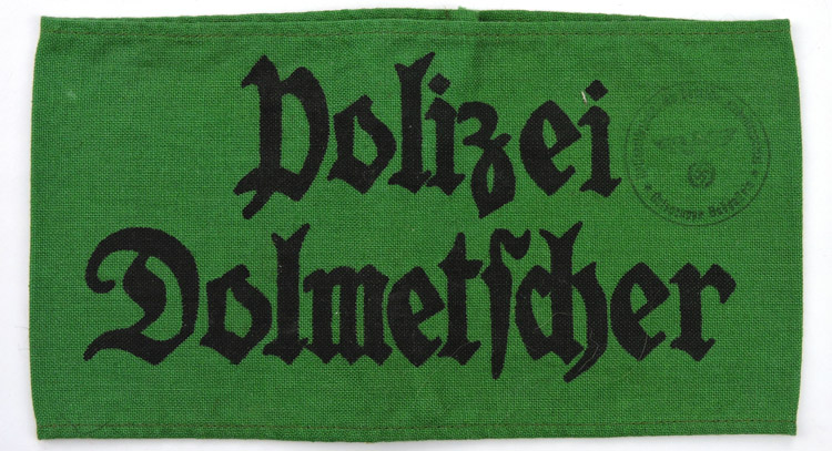 Police Interpreter armband. Green cotton/rayon construction with black printed script "Polizei Dolmetscher". Faint property stamp to the front. Scarce.