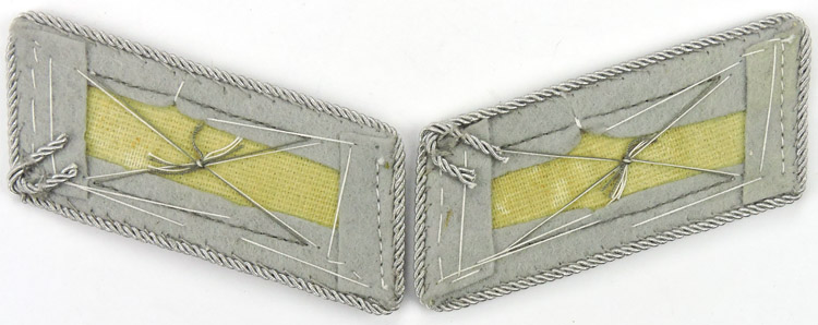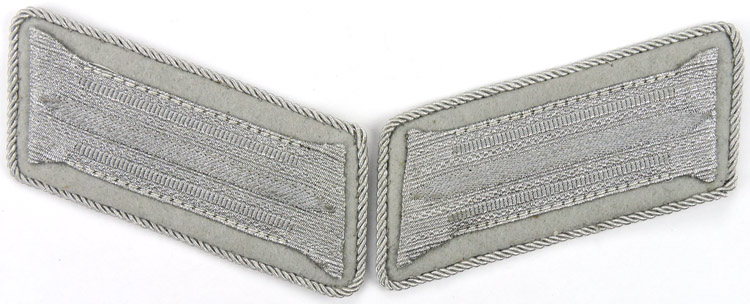 PHYSICAL DESCRIPTION: Machine woven collar tabs with a light grey base with machine woven litzen in bright, silver/aluminum flat-wire threads. The light grey base shows through as the branch of service and center stripes and the collar tabs are trimmed in fine, bright, twisted, silver/aluminum cording. Mint & nice!
