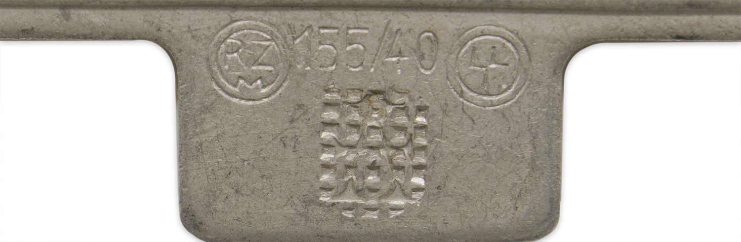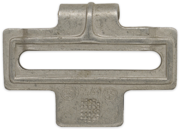 PHYSICAL DESCRIPTION: Roughly 45mm x 38mm, standard issue, stamped aluminum buckle catch as found on EM/NCO’s belts. Impressed manufacturer’s RZM/SS contract code number and date, "155/40", flanked by SS runes and the RZM logo within dual circular outer borders.