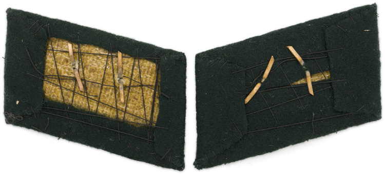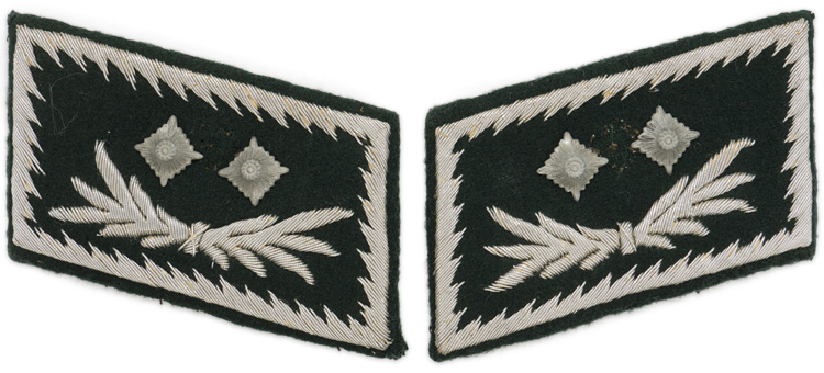 PHYSICAL DESCRIPTION: The 1937 pattern bottle green wool, construction collar tabs with hand embroidered, acanthus leaves to the bottom of the forward edge, a saw-toothed outer edge border all in silver/aluminum flat-wire threads and two, silver washed, stamped alloy rank pips. Nice high quality pair. (Ex Philippe Gillain Collection)