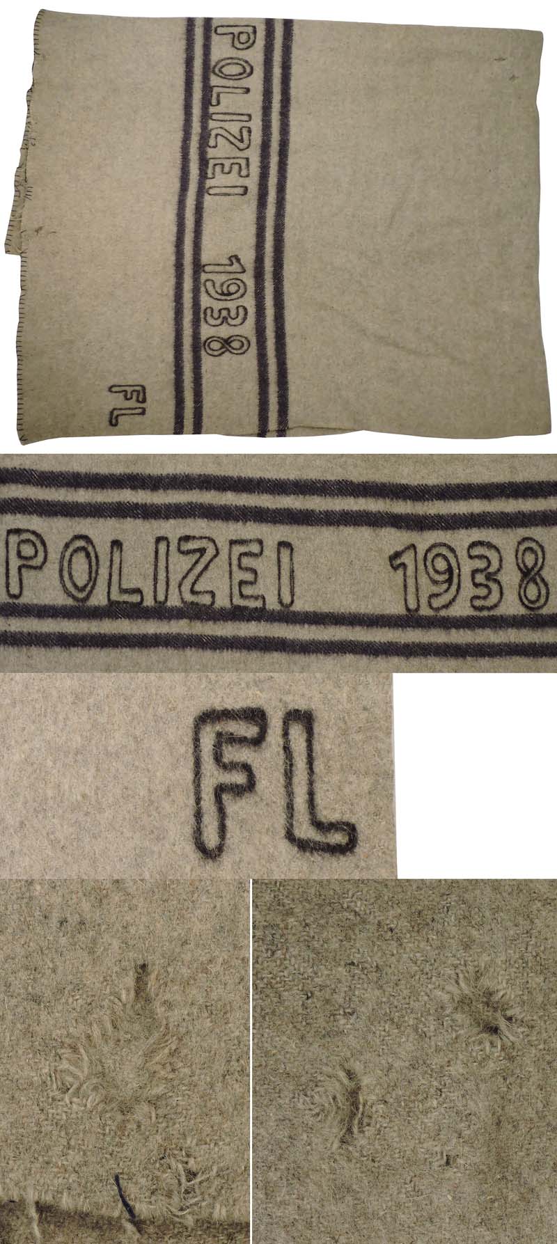 A light grey, wool blanket measuring approximately 204cm x 254cm with four, 2cm wide blue stripes with "1938 Polizei 1938" and "FL". There are holes to the surface, as well as the thread to the finished ends has either pulled away or become loose.