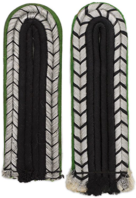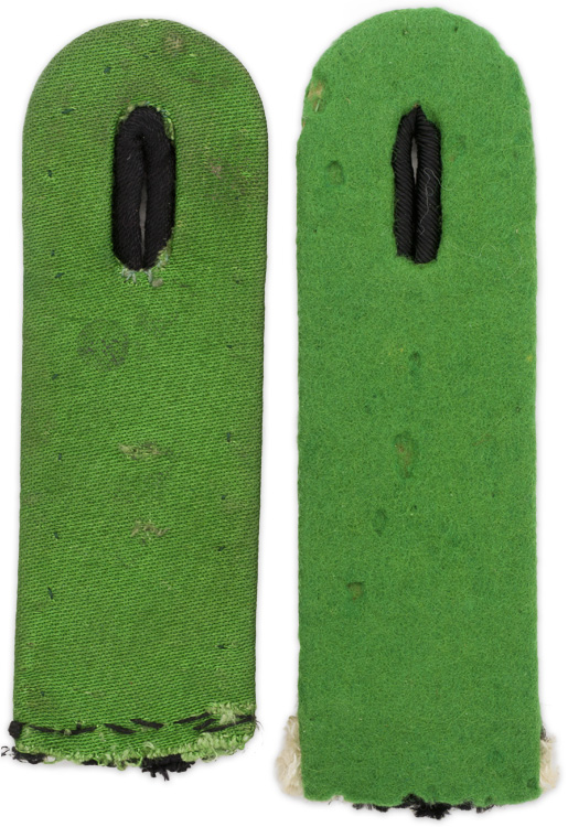 PHYSICAL DESCRIPTION: 1942 Pattern sew on examples. The shoulder boards feature dual, outer edge, matte silver/aluminum Russian braid with evenly spaced, interwoven black "V"s, encompassing dual, inner, black braids, mounted on a green wool truppenfarbe base. Rank of Unterscharführer. Slightly missmatched.
