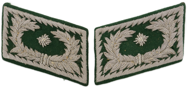 PHYSICAL DESCRIPTION: 1937 pattern bottle green wool, construction collar tabs with hand embroidered, acanthus leaves to the bottom of the forward edge, a saw-toothed outer edge border all in silver/aluminum flat-wire threads and a single rank pip for ZollOberregierungsrat.
