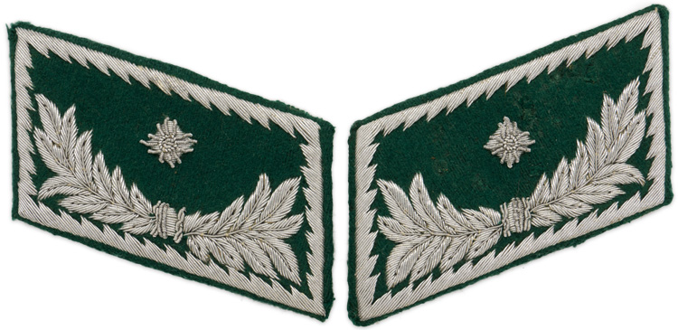 PHYSICAL DESCRIPTION: The 1937 pattern bottle green wool, construction collar tabs with hand embroidered, acanthus leaves to the bottom of the forward edge, a saw-toothed outer edge border all in silver/aluminum flat-wire threads and one rank pip. Nice matched pair.