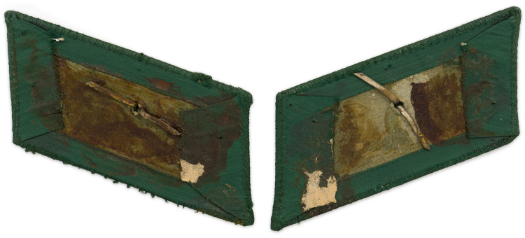 PHYSICAL DESCRIPTION: The 1937 pattern collar tabs features a machine woven, bottle green rayon construction base with machine woven acanthus leaves to the bottom of the forward edge and a saw-toothed outer edge border in bright silver/aluminum flat-wire threads and a single, stamped rank pip. The collar tabs are mounted on a cardboard base.