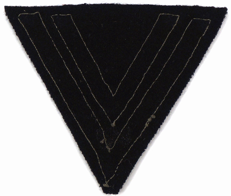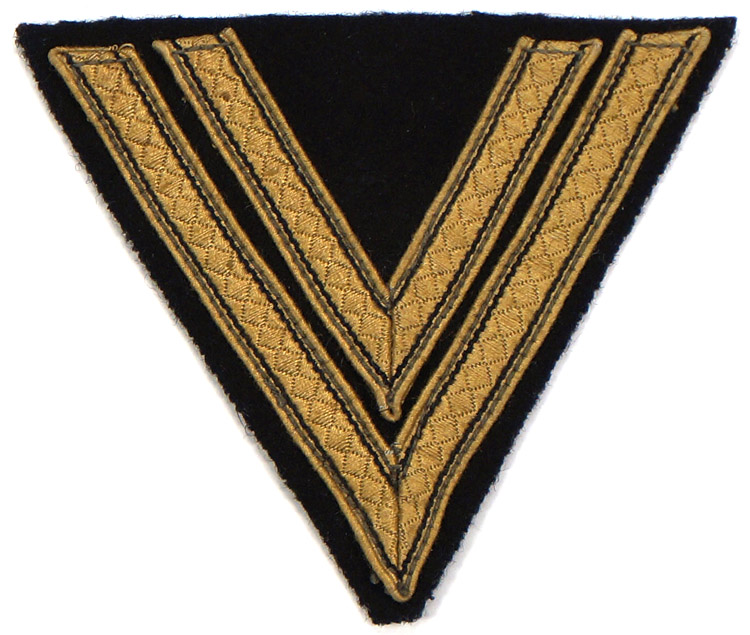 PHYSICAL DESCRIPTION: The insignia consists of dual, subdued, woven, golden/tan rayon diamond patterned tress chevrons with a fine interwoven black stripe to both the outer and inner edges of each, machine sewn to an inverted triangular black wool base.