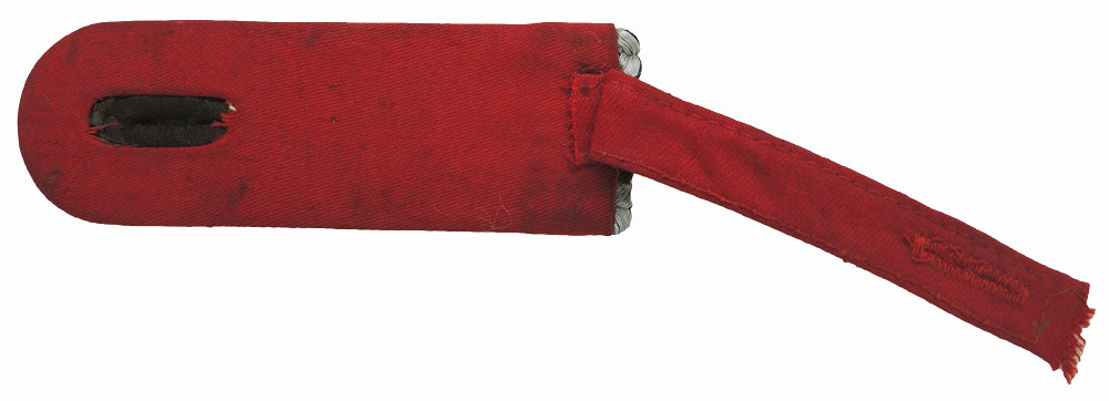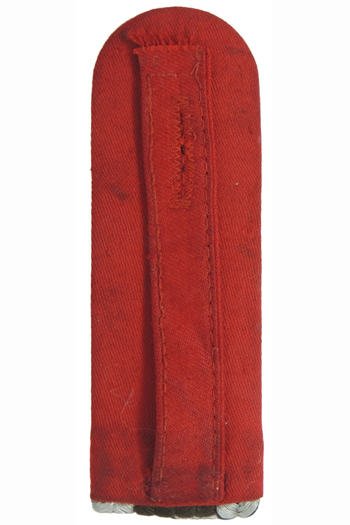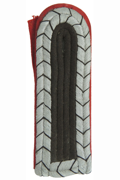 PHYSICAL DESCRIPTION: Second pattern, (circa 1936-1945), slip on shoulder board as introduced along with new uniforms in July 1936. The shoulder board features dual, outer edge, bright, silver/aluminum Russian braid with evenly spaced, interwoven dark brown "V"s, encompassing dual, inner, dark brown braids, all mounted on a carmine rayon truppenfarbe base. Complete with original slip on strap.