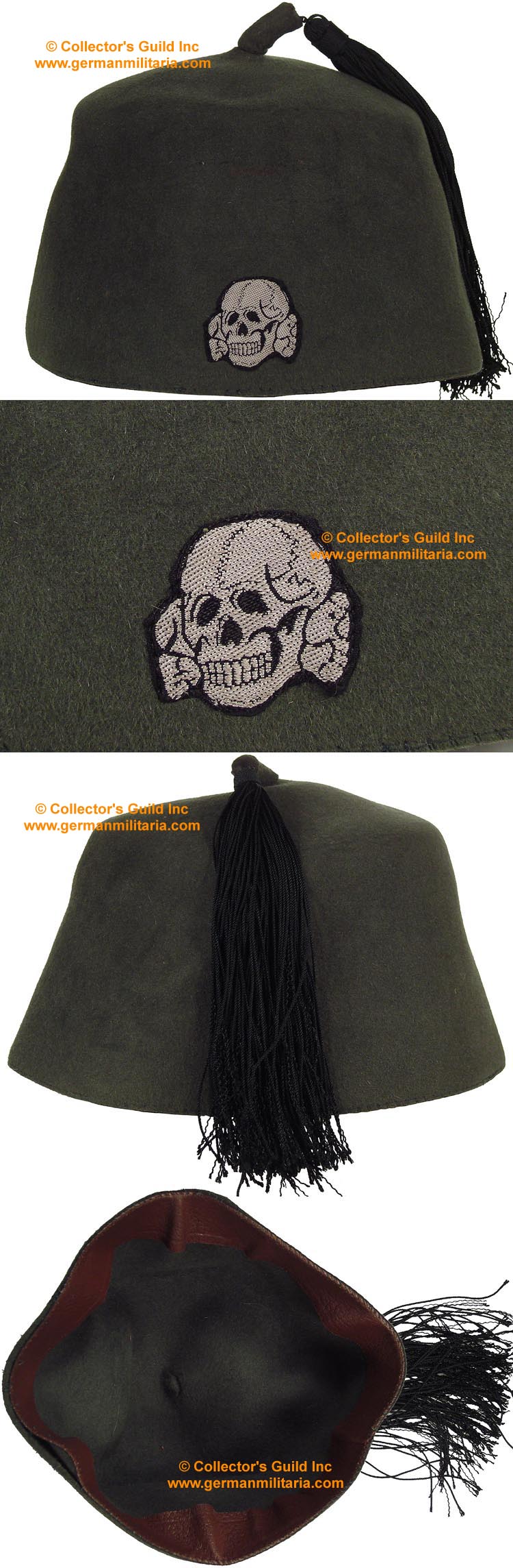 PHYSICAL DESCRIPTION: Nice quality, formed, field-grey, rabbit fur felt, construction service uniform fez. The fez features a two piece tassel to the top center of the crown. The tassel has a short piece of field-grey felt inserted and stitched into the center of the crown with the correct, dark green, multi-strand, silk type material tassel sewn to the top. The front center of the fez features a machine woven 1934 pattern, skull and cross bones, (Totenkopf), in silvery/grey, rayon threads with black accent threads, also mounted on a cut-out, woven, black, rayon base. The skull features a bottom jaw, dual rows of teeth and nice eye, nose and cranium detailing. Skull has original machine stitching to the fez. Eagle has been removed. The unlined interior has a grained, brown, leather sweatband machine stitched to the bottom edge. Inside of the sweatband is the size marking "58". Nice clean example.