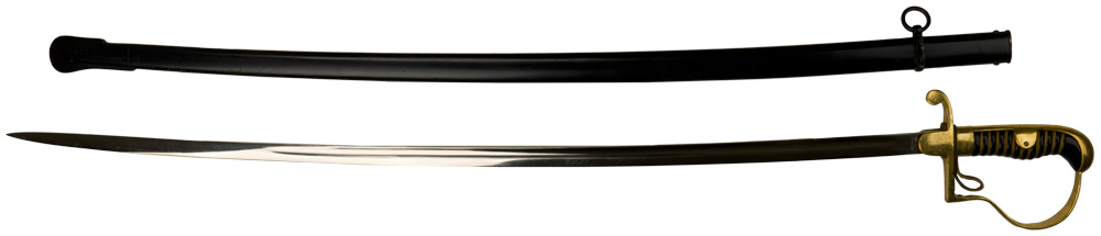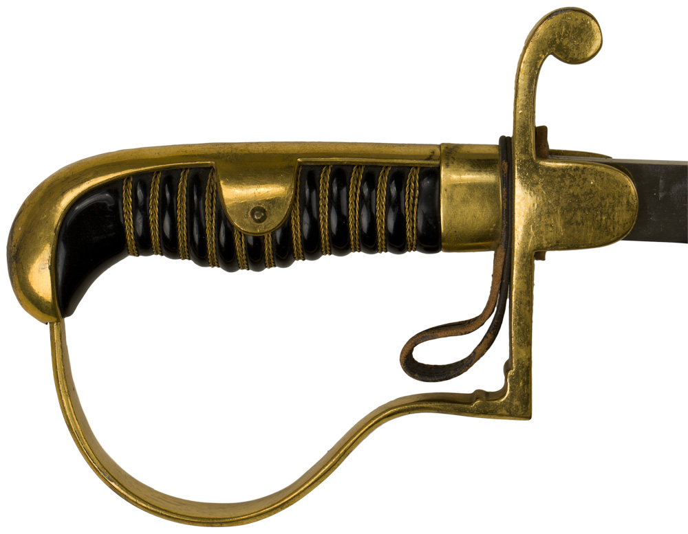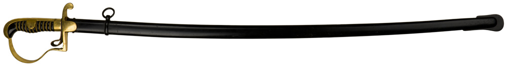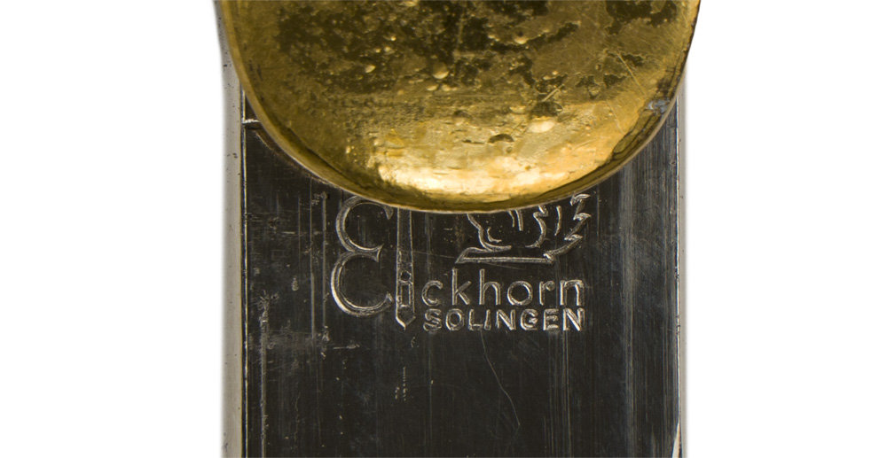 PHYSICAL DESCRIPTION: The nice quality, Fire Police NCO’s sword features a roughly, 33 1/2", (85cm), long, single edged, nickel/silver plated, drop forged steel construction blade, with roughly, 21 1/2", (54.5cm), long, shallow fullers to each side and a full length, including the hilt, of roughly, 38 3/4", (98.4cm). The age dulled, un-sharpened blade is in overall good condition with a few small surface scratches and scuffs and some small areas of light surface spotting and some minor pitting, primarily to the tip. The reverse ricasso is well marked with the acid etched manufacturer’s logo, script, name, and location, consisting of a seated squirrel, clutching a downward pointing sword with the name and location, "Carl Eickhorn Solingen", positioned beneath the squirrel and the script, "Original", positioned above the squirrel. Of Note: This version of Eickhorn’s logo was utilized circa 1935-1941. Also Of Note: The manufacturer’s squirrel logo is a clever "word play" on the manufacturer’s last name Eickhorn, whereas "squirrel", in German is Eichhörnchen, or colloquially Eichhorn. The brown leather, blade washer is still intact. The saber has die cast, brass alloy langets, cross guard, ferrule, "P", knuckle bow, back-strap and a "dove" pommel with a gilt finish. A brown leather finger loop is between the ferrule and cross guard as a solely decorative addition. The saber has a contoured, molded, black, bakelite grip with a central bulge, and repeating, recessed, horizontal grooves with dual, inset, twisted, brass wire wrap, flanked at both the top and bottom edges by fine, dual strands, of twisted, brass wire wrap. The saber comes with its original, black painted, tooled sheet metal construction scabbard. The scabbard retains about 90% of its black paint. The scabbard has an integral drag to the bottom edge and a sweated on horizontal scabbard band near the top edge with a raised, rectangular, suspension bar to the reverse and a suspension ring to the reverse edge. Both of the original two, small, dome headed throat retaining screws are intact. Of Note: A photographic example of this model appears in J.R. Angolia’s book, Swords of Germany 1900/1945, on page 257 as Model Nr. 40 . Nice clean example.