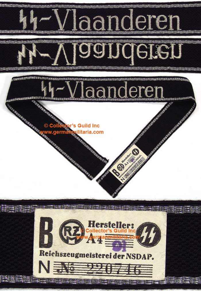 PHYSICAL DESCRIPTION: Full length, EM/NCO’s machine woven, black rayon construction, RZM pattern cufftitle features machine embroidered, Latin script, "SS - Vlaanderen", in silvery/grey cotton threads. The script stands out in nice high relief. The cufftitle is bordered at both the top and bottom edges in horizontally woven, seven strand, bright, silver/aluminum wire threads. The full length cufftitle has folded over, machine stitched ends. The reverse of the cufftitle has a white paper RZM/SS tags with black printed script and the blue inkstamped manufacturer’s numerical code. Scarce cufftitle.