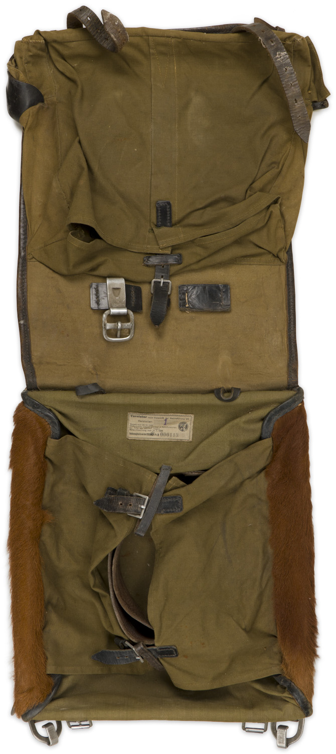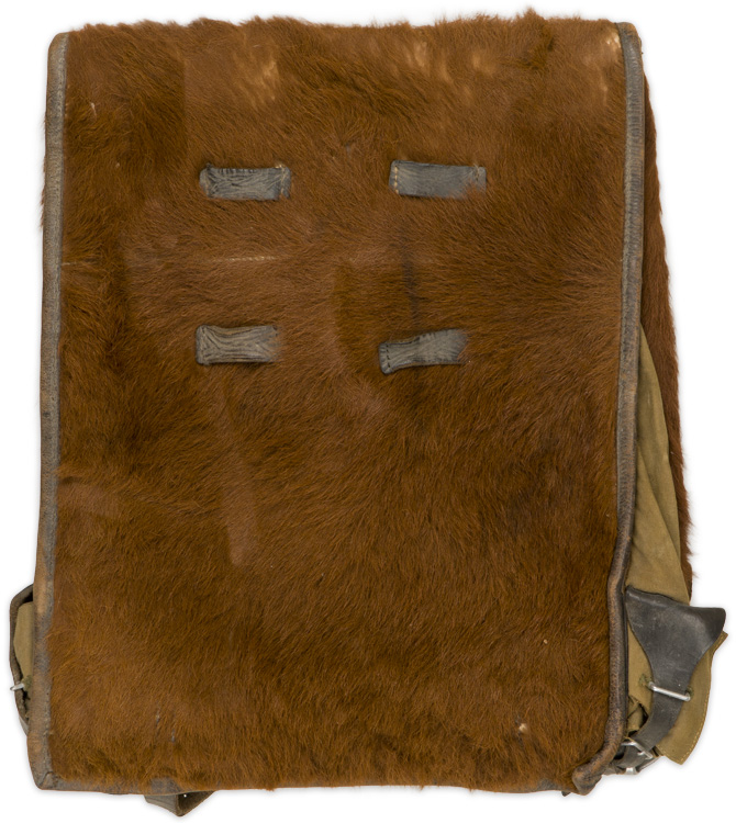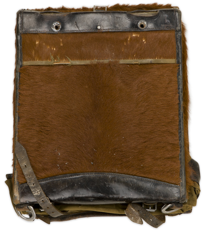 PHYSICAL DESCRIPTION: An olive drab, fur covered canvas pack with leather and canvas fittings, roughly 32cm wide, 40cm tall and 10cm deep, with a fold-over flap that covers its entire front. The majority of the straps, buckles and buttons look to be complete (they are inside the pack and need to be attached). Nice SS/RZM marking to the back of the pack and still has its original oilcloth RZM tag. Shows the expected age and use.