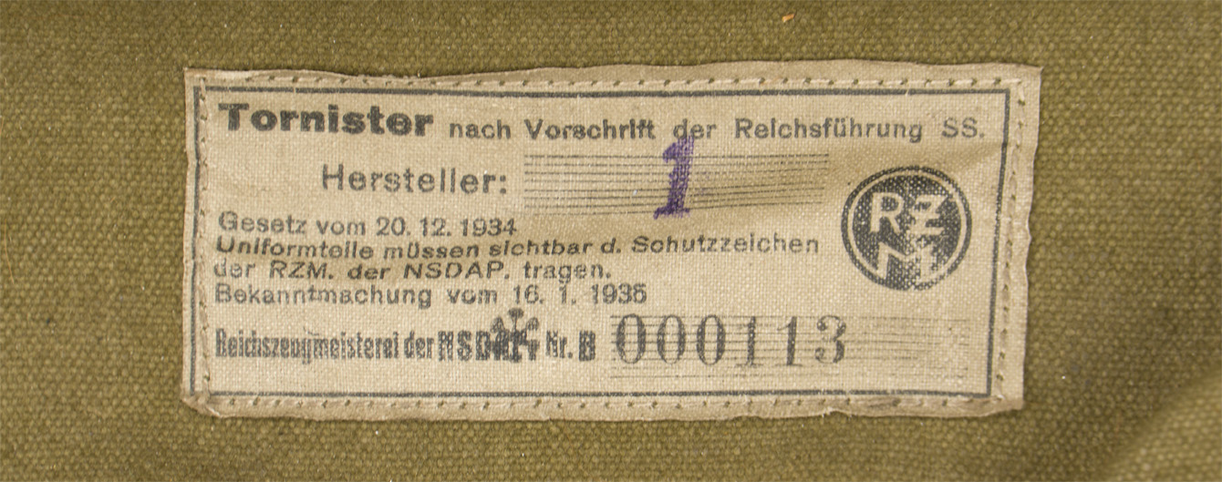 (Tornister)BACKGROUND: The M34 backpack was based on the Prussian model 1885 and the Reichswehr era M1907/13 backpacks, with minor variations, and was officially introduced on November 1ST 1934. The SS-FHA, SS-Führungshauptamt, (SS-Operational Headquarters), and the SS-WVHA, SS-Wirtschafts und Verwaltungs Hauptamt, (SS-Economic and Administration Department) were the two organizations responsible for supplying and maintaining all personnel of the SS. The SS-FHA was responsible for issuing the initial equipment, supply and maintenance of weapons and ammunition, and the supply of technical equipment and transport vehicles. The SS-WVHA, was responsible for issue of clothing and personal equipment items as well as rations including horse and pack animal fodder and personal fuel items. Of Note: These M34 packs were to be replaced with the M1939 backpack, that was introduced along with the combat Y-straps on April 18TH 1939, but the transition was never fully accomplished and the M34 packs were manufactured through-out the war in limited quantities. During the war the early M34 and M39 "pony fur" backpacks were found to be too expensive and time consuming to produce which resulted in the production of a wide variety of less expensive canvas construction combat rucksacks and backpacks. Also Of Note: The RZM, Reichzeugmeisterei, (National Equipment Quartermaster), was official founded in June 1934 in Munich by the NSDAP as a Reich Hauptamt, (State Central Office), and was based on the earlier SA Quartermaster’s Department. The functions of the RZM were not only to procure and distribute items to Party formations, but also to approve chosen designs and to act as a quality control supervisor to ensure items manufactured for the Party met required specification and were standardized. Starting in late 1934 items manufactured for the SS came under the quality control of the RZM and were marked with an appropriate RZM/SS approval mark. In 1943 the Waffen-SS assumed full control over their uniform and equipment production and no longer fell under the authority of the RZM.