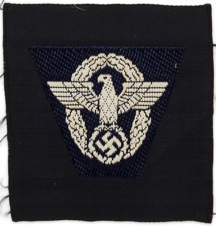 PHYSICAL DESCRIPTION: The insignia consists of a machine woven black rayon base featuring a machine woven, second pattern, (Circa June 1936-May 1945), right facing, police cap eagle with out-stretched wings, clutching a wreathed, canted swastika in it’s talons, encompassed by a vertically oval, oak-leaf wreath all in silver/white rayon threads.
