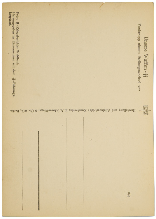 A black and white photo postcard from the "Unsere Waffen-SS", (Our Waffen-SS) series. It is titled "Funktrupp Nimmt Stellungswechsel vor" or "Funktrupp Makes Position Change." Shows minor yellowing that is typical of the age, but overall is a nice example.