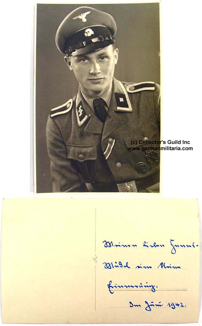(Photographie Postkarte) BACKGROUND: Basic human instinct dictates that soldiers in the field, regardless of nationality, long for their loved ones at home. As a result it was very common for these soldiers to purchase, or appropriate, "sweetheart" items and send them home. Although there was almost an unlimited selection of "sweetheart" items one of the most popular items were the photograph postcards which were relatively inexpensive, easily mailed and distinctly personal. There were also numerous other reasons to pose for a photograph, including new appointments, promotions, weddings anniversaries etc., etc. PHYSICAL DESCRIPTION: Roughly, 5 3/8" x 3 3/8", light weight cardstock postcard with a black and white portrait style photograph of a young SS-Unterscharführer wearing a field-grey visor cap and M40 style field-grey tunic. The visible uniform details include the cap insignia, shoulder straps, collar tabs and collar tress trim, a whistle lanyard, an Iron Cross 2ND class ribbon, an Infantry Assault Badge, a DRL Sports Badge and an EM/NCO’s belt buckle. The reverse of the postcard has handwritten Sütterlin script that appears to include the photography subjects name and the date, "Juni 1942". The postcard is in overall very good condition with minimal age yellowing. Nice image.GRADE **** PRICE $120.00